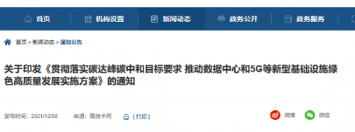 近日,国家发改委、中央网信办、工信部、国家能源局四部门印发《贯彻落实碳达峰碳中和目标要求推动数据中心和5G等新型基础设施绿色高质量发展实施方案》(下称方案),推进5G等新型基础设施低碳绿色发展。方案提出,数据中心、5G是支撑未来经济社会发展的战略资源和公共基础设施,也是关系新型基础设施节能降耗的最关键环节。有序推动以数据中心、5G为代表的新型基础设施绿色高质量发展,发挥“一业带百业”作用,助力实现碳达峰碳中和目标。 这意味着,作为中国经济社会高质量发展的新引擎、新动能,数据中心与5G等新基建成为“双碳”重要发力点。
