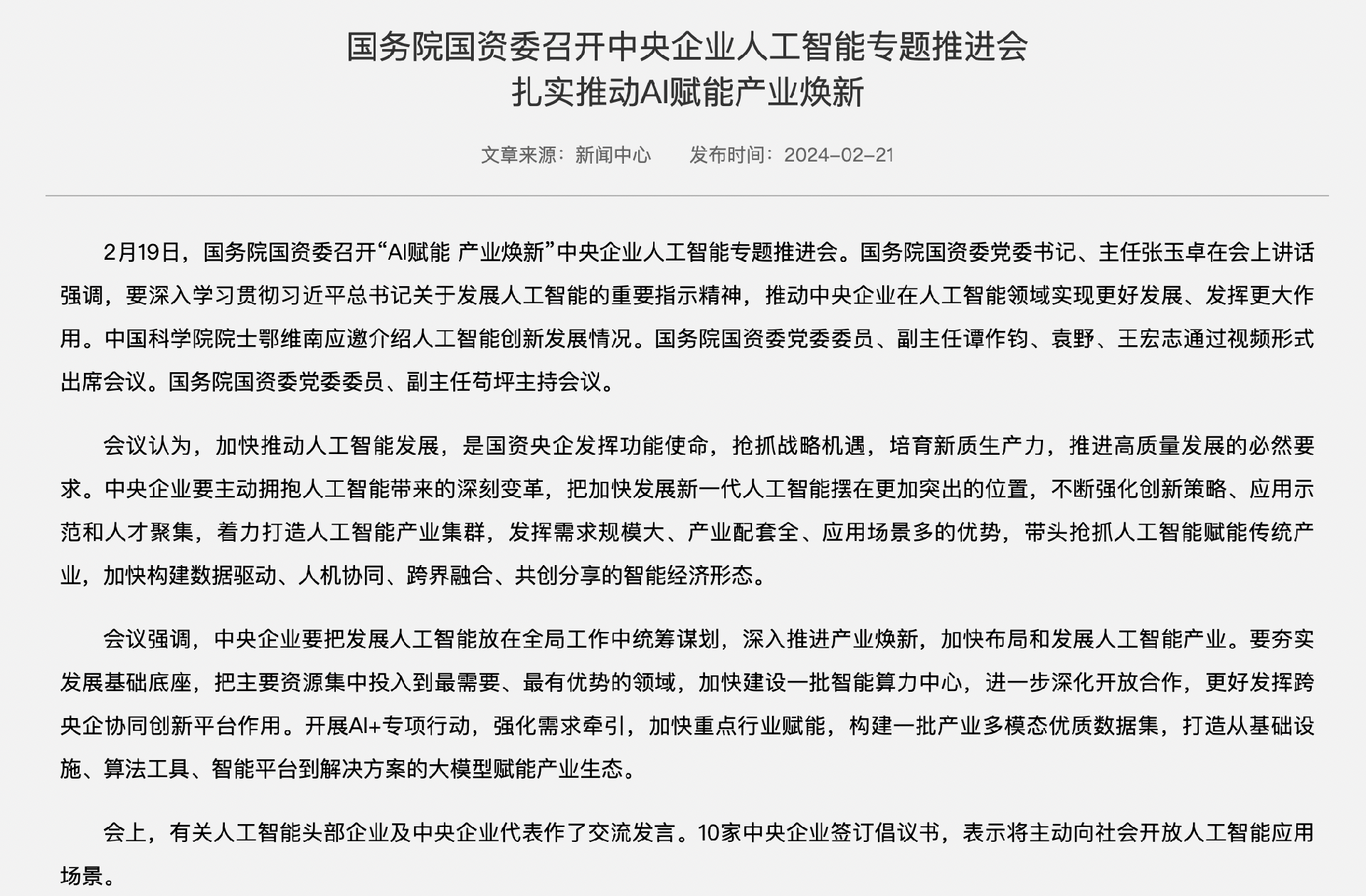 国务院国资委官网2月21日消息,2月19日,国务院国资委召开“AI赋能产业焕新”中央企业人工智能专题推进会。国务院国资委党委书记、主任张玉卓在会上讲话强调,要深入学习贯彻习近平总书记关于发展人工智能的重要指示精神,推动中央企业在人工智能领域实现更好发展、发挥更大作用。中国科学院院士鄂维南应邀介绍人工智能创新发展情况。国务院国资委党委委员、副主任谭作钧、袁野、王宏志通过视频形式出席会议。国务院国资委党委委员、副主任苟坪主持会议。 图注:国务院国资委官网截图 会议认为,加快推动人工智能发展,是国资央企发挥功能使命,抢抓战略机遇,培育新质生产力,推进高质量发展的必然要求。中央企业要主动拥抱人工智能带来的深刻变革,把加快发展新一代人工智能摆在更加突出的位置,不断强化创新策略、应用示范和人才聚集,着力打造人工智能产业集群,发挥需求规模大、产业配套全、应用场景多的优势,带头抢抓人工智能赋能传统产业,加快构建数据驱动、人机协同、跨界融合、共创分享的智能经济形态。 会议强调,中央企业要把发展人工智能放在全局工作中统筹谋划,深入推进产业焕新,加快布局和发展人工智能产业。要夯实发展基础底座,把主要资源集中投入到最需要、最有优势的领域,加快建设一批智能算力中心,进一步深化开放合作,更好发挥跨央企协同创新平台作用。开展AI+专项行动,强化需求牵引,加快重点行业赋能,构建一批产业多模态优质数据集,打造从基础设施、算法工具、智能平台到解决方案的大模型赋能产业生态。 会上,有关人工智能头部企业及中央企业代表作了交流发言。10家中央企业签订倡议书,表示将主动向社会开放人工智能应用场景。 相关文章