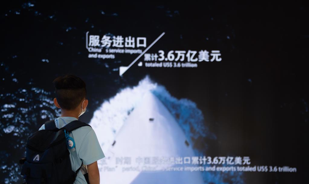 这是9月4日拍摄的国家会议中心中国服务贸易发展成就展现场。(新华社记者陈钟昊摄) 英国48家集团俱乐部主席斯蒂芬·佩里指出,今年服贸会聚焦数字经济领域创新,为世界捕捉中国发展过程中的机遇提供了绝佳机会。 参展的机构和企业均瞄准了中国市场的广阔前景和重要机遇。爱尔兰软件服务供应商WrxFlo公司首席执行官蒂姆·克罗说,公司开发的产品在中国有广阔市场。参加本次服贸会对提高公司知名度和寻找新合作伙伴都很重要。服贸会是一个非常好的平台。 哈萨克斯坦中国贸易促进协会会长哈纳特·拜赛克指出,中国数字经济和电商发展经验具有重要借鉴意义,哈中两国数字经济领域的互利合作前景广阔。