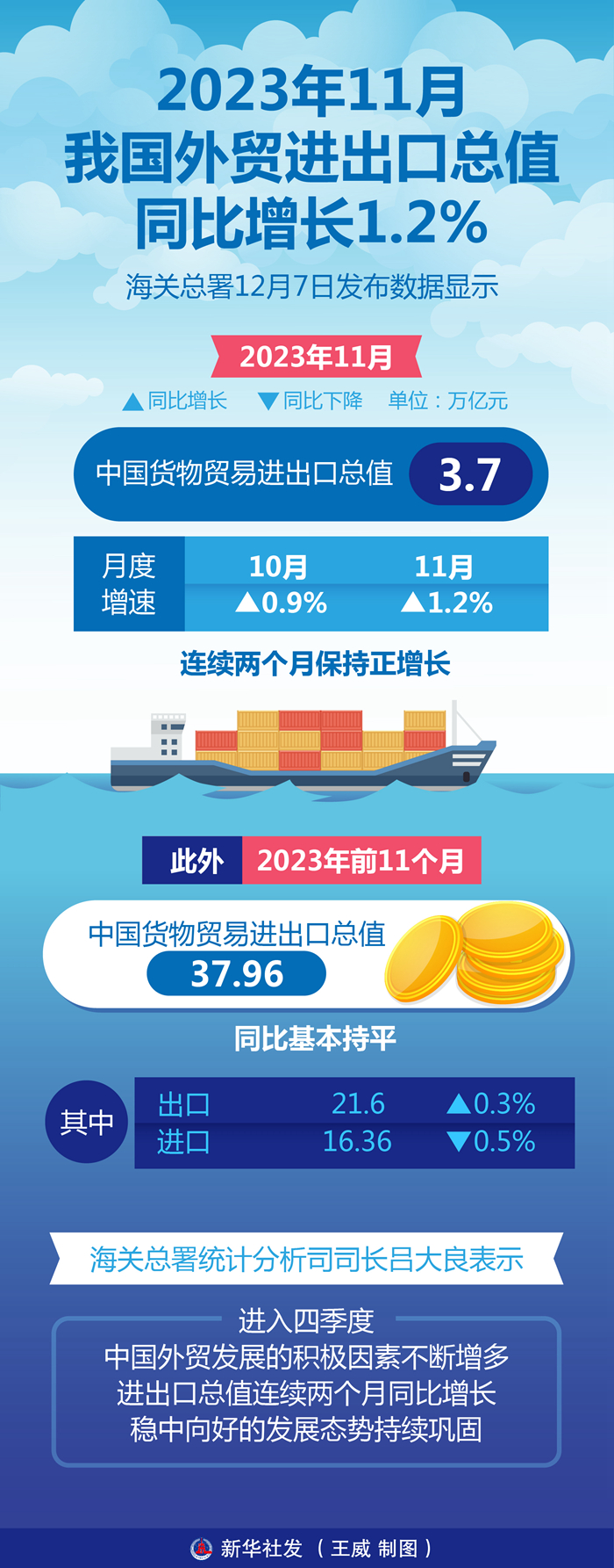新华社北京12月7日电 题:外贸持续稳中向好,全年目标实现可期 新华社记者魏弘毅、林光耀 年终岁尾,中国外贸顶住压力,持续回稳。海关总署12月7日发布数据显示,继10月份我国外贸月度、累计增速双双转正后,11月单月进出口同比增速进一步扩大至1.2%,累计增速则与去年同期基本持平。 对此,海关总署统计分析司司长吕大良表示,进入四季度,我国外贸发展的积极因素不断增多,进出口总值连续两个月同比增长,稳中向好的发展态势持续巩固。 业内专家分析认为,在海外需求趋缓等多重压力之下,外贸单月增速实现从“四连降”到“二连升”,实属不易。这是贸易主体、经贸伙伴、创新动能等多方因素共同作用的结果。 首先,从贸易主体看,今年以来,作为我国外贸主力军的民营企业进出口持续活跃,同比增速表现好于整体:前11个月进出口20.24万亿元,同比增长6.1%,占我国进出口总值的53.3%,提升3.1个百分点,有力支撑了我国外贸稳规模优结构。 其次,从经贸伙伴看,在对新兴市场进出口继续保持良好发展态势的同时,我国对部分传统市场的贸易也出现积极变化。 11月份,我国对前三大贸易伙伴东盟、欧盟、美国分别进出口5843.9亿元、4416.6亿元、4149亿元,合计占我国进出口总值的38.9%。其中,中美货物贸易同比增长2.7%,结束连续6个月的同比下降;同期,对拉美、非洲、中亚五国进出口分别增长9.3%、8.4%、43%,表明我国持续扩大与新兴市场的贸易规模,区域合作紧密、贸易多元共进的国际市场布局继续优化。 另外,外贸稳中向好,还离不开创新动能的持续增强。记者近日在新疆喀什综合保税区看到,得益于喀什海关持续优化监管服务,一辆辆满载新能源汽车的轿运车正在有序排队通关,呈现出一派火热繁忙景象。 据统计,前11个月,我国汽车及其零配件、船舶等出口增长较快,增速分别为42.8%、36.5%。以电动载人汽车、太阳能电池、锂电池为代表的“新三样”等新兴产业出口规模快速增长,已经成为外贸加速提质升级的生动写照。 吕大良表示,近期汽车、手机等部分商品出口表现亮眼,既反映了相关行业外部需求回暖,也充分体现了我国制造业的综合竞争优势。 不过,业内人士也指出,当前,世界经济复苏势头不稳仍然是我国外贸面临的最大挑战,经济因素和非经济因素相互交织,我国外贸依然面临不小压力。 应对这一形势,政策正在持续加力。记者获悉,商务部充分发挥展会平台的贸易促进作用,加大对企业参加境内外展会的支持;还将推动加大进出口信贷支持,促进银企精准对接,加大对中小微外贸企业支持力度以及扩大出口信用保险承保规模和覆盖面,为企业开拓市场保驾护航等;海关总署日前出台推动加工贸易持续高质量发展改革实施方案,推出16条改革措施,创新海关加工贸易监管模式,继续巩固提升加工贸易内通外联优势…… 企业也在不断开辟发展新空间。在宁波君灵模具技术有限公司的生产加工车间,几名工人操作电脑就能实现对各环节的管控。企业电子大屏上,生产计划、物料管理等数据实时刷新;一线工人可实时反馈工序情况并跨部门进行层级联动。 “模具企业生产环节的工序非常繁杂,如果仅仅依赖人力,会造成很多资源的浪费。”公司总经理姚贤君表示,在开展数字化转型后,企业整体效率提升了30%以上,有力保障了内外贸产品供应。 四季度通常是外贸旺季,也是全年外贸的冲刺与收官季。展望未来,吕大良表示,总体来看,政策给力、企业努力、各方合力,四季度出口趋稳向好势头有望继续巩固。根据中国海关贸易景气统计调查,反映出口、进口订单增加的企业占比均有提升,实现全年外贸促稳提质目标的基础更加坚实。