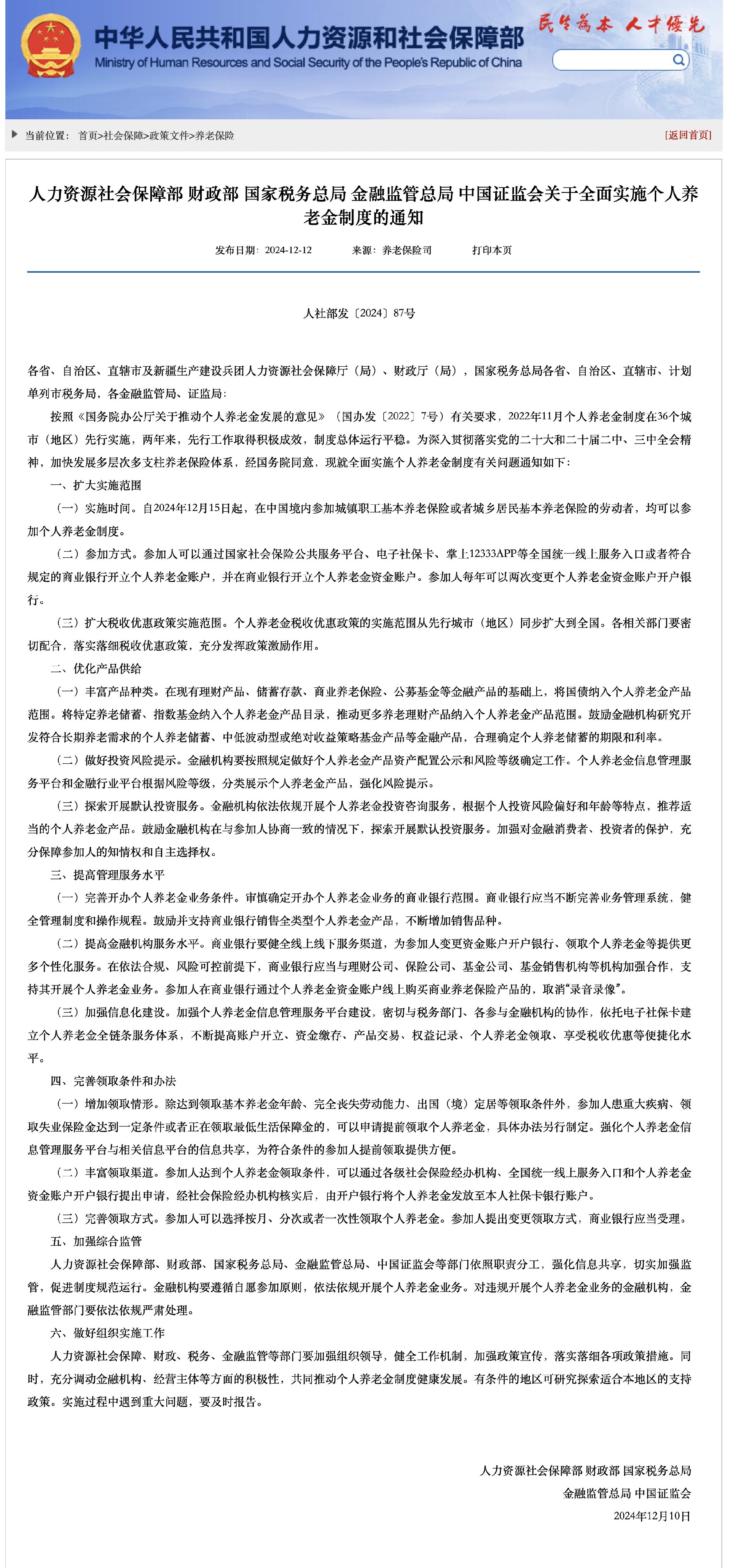12月12日,人力资源和社会保障部、财政部、国家税务总局、金融监管总局、中国证监会印发《关于全面实施个人养老金制度的通知》(以下简称《通知》)。就个人养老金制度,《通知》明确,扩大实施范围、优化产品供给、提高管理服务水平、完善领取条件和办法、加强综合监管、做好组织实施工作。 要点速览: 1.自2024年12月15日起,在中国境内参加城镇职工基本养老保险或者城乡居民基本养老保险的劳动者,均可以参加个人养老金制度。 2.税收优惠政策的实施范围从36个先行城市(地区)同步扩大到全国。 3.丰富产品种类。在现有理财产品、储蓄存款、商业养老保险和公募基金产品基础上,将国债、特定养老储蓄、指数基金纳入个人养老金产品范围。 4.增加领取情形。参加人患重大疾病、领取失业保险金达到一定条件或者正在领取最低生活保障金的,可以申请提前领取个人养老金。