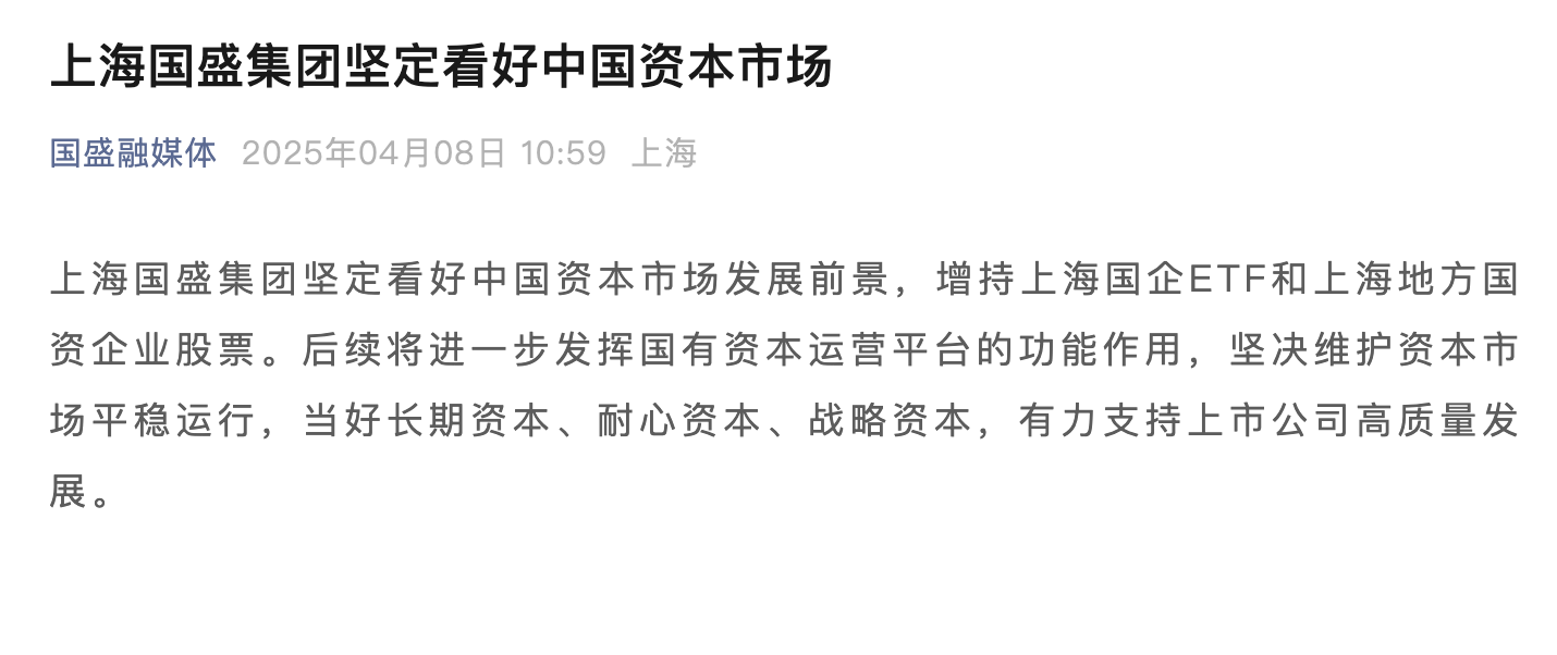 4月8日,上海三大国有投资平台发文称,坚定看好中国资本市场发展前景。 上海国有资本投资有限公司发文称,坚定持有战略性持股机构和上市企业股权,充分发挥国有资本投资运营公司功能作用,聚焦“基金管理+创新孵化”,通过与上市公司推进CVC、并购基金、科技成果孵化转化等形式进行上市公司价值维护,坚定当好长期资本、耐心资本、战略资本。 上海国际集团有限公司发文称,长期看好并坚定持有战略持股机构和上市公司股权,积极推进上市公司价值提升、价值创造、价值维护,切实发挥“金融控股+市值管理”核心功能,有力支持上市公司高质量发展。 上海国盛(集团)有限公司发文称,增持上海国企ETF和上海地方国资企业股票。后续将进一步发挥国有资本运营平台的功能作用,坚决维护资本市场平稳运行,当好长期资本、耐心资本、战略资本,有力支持上市公司高质量发展。