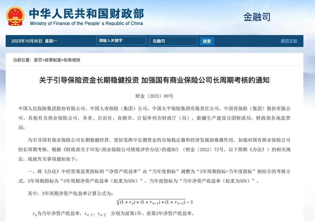 图片来源:财政部网站 财政部有关负责人在答记者问时表示,《通知》进一步加强国有商业保险公司长周期考核,并对其投资管理提出了相关要求,主要目的在于:按照保险行业运营规律,增强资产与负债的匹配性,继续引导国有商业保险公司长期稳健经营,防止因单纯考核年度目标,出现突增业绩、忽视风险的短期行为,鼓励其进行长期投资、稳定投资、价值投资。同时,也有利于更好发挥中长期资金的市场稳定器和经济发展助推器作用。 《通知》将《商业保险公司绩效评价办法》(财金〔2022〕72号,以下简称《办法》)中经营效益指标的“净资产收益率”由“当年度指标”调整为“3年周期指标+当年度指标”相结合的考核方式,其中,3年周期指标和当年度指标权重各占50%。3年周期指标采用近3年净资产收益率几何平均数,当年度指标采用当年净资产收益率。 同时,为引导国有商业保险公司投资经营更好匹配保险资金长期属性,对于国有商业保险公司投资管理,《通知》在投资资质、资金投向和内部管理方面提出了相关要求。 上述负责人介绍,一是在投资资质方面。国有商业保险公司应当依法合规开展各类投资,遵守监管要求的偿付能力、风险管理、公司治理等相关规定,匹配自身投资管理能力、风险控制能力和相关资质。 二是在资金投向方面。国有商业保险公司要坚持审慎、安全、增值的原则,根据保险资金长期属性,平衡好投资收益和风险,优化资产配置,保险资金要投向风险可控、收益稳健、具有稳定现金流回报的资产。 三是在内部管理方面。国有商业保险公司要制定专门的投资管理制度,建立透明规范的投资决策程序,设置科学有效的投资风险评估体系,做好投资项目的尽职调查和可行性研究,加强投资风险管理、交易管理和投后管理等。 同时,《通知》还进一步强调绩效评价结果运用,要求国有商业保险公司进行经营业绩对标,分析差距、找出原因,并进一步强化绩效评价数据真实性的要求。自2023年度绩效评价起,国有商业保险公司按照《办法》及《通知》执行,其他商业保险公司可参照执行。 相关文章