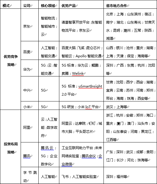 来源:根据公开资料整理 综合产品优势、地方合作、业务布局、投资合作等诸多因素来看,头部科技互联网公司新基建市场竞争力可分为三个梯队:第一梯队包括京东、阿里、腾讯、百度和华为;第二梯队包括字节跳动、中兴和小米;第三梯队包括苏宁、网易和拼多多。具体来看: 第一梯队特点:综合实力强,布局范围广,政府合作能力强。第一梯队公司有明显的“技术+资本+战略”优势,布局范围较广,涉及数字政府、智能城市、智能交通、产业园建设、5G、人工智能、区块链、大数据等诸多领域。同时,这些公司和地方政府合作密切,一方面赋能地方公共服务,一方面从顶层战略层面切入地方产业。比如,阿里布局包括数字政府、智能城市、科技园项目、数据/云计算、人工智能、芯片等10多个领域,且每个领域均有成功案例;阿里的政府合作能力较强,目前已与全国30个省市区达成合作,数字政务服务覆盖全国442个城市。如阿里已和杭州“深度绑定”,形成了阿里政企合作的样板。2019年,阿里整合阿里云、支付宝、钉钉、高德等技术、产品、服务、资源,全面升级服务数字政府战略,即“数字政府2.0”。阿里云是阿里推进数字政府、企业服务、技术赋能的核心。国际研究机构Gartner在4月发布的云计算市场追踪数据显示,阿里云亚太市场排名第一,全球市场排名第三。阿里云还宣布未来3年再投2000亿,用于云操作系统、服务器、芯片、网络等重大核心技术研发攻坚和面向未来的数据中心建设,2020年阿里云再招5000人,重点吸引云服务器、网络、芯片、数据库、人工智能等核心技术领域的攻坚人才。 腾讯则在新基建市场进行了整体谋划,技术和产业园布局较为领先。今年5月,腾讯宣布,未来五年将投入5000亿元布局新基建,云计算、人工智能、区块链、服务器、大型数据中心、超算中心、物联网操作系统、5G网络、音视频通讯、网络安全、量子计算等都将是腾讯重点投入领域。在数据中心方面,腾讯将陆续在全国新建多个百万级服务器规模的大型数据中心。同时,腾讯还将结合产业技术创新需要,重点投入云启产业基地、工业互联网基地、创新中心、产业园区等方面的建设。目前来看,腾讯在数字政府、产业园、企业数字化、智慧医疗、云计算、5G、人工智能等领域有一定竞争力。未来,技术赋能、数据资产、产业园等将成为腾讯新基建布局发力的关键因素。 第二梯队特点:立足比较优势,布局细分市场。第二梯队公司在新基建市场布局方面更加聚焦垂直,重点布局自身优势领域,在垂直细分市场有一定竞争力。比如字节跳动在ToB领域、人工智能领域占据优势。在企业服务层面,继飞书后,近期字节跳动还推出了企业服务平台“火山引擎”,该平台包括智能推荐、机器翻译等产品,以及短视频、视频互动等解决方案,进军企业云服务。小米的优势是“5G+AloT”,故其从智能手机、智能家居等领域切入布局,以此构建“万物互联+智能场景”生态链。小米宣布,未来五年将在“5G+AIoT”领域投资500亿元。 第三梯队特点:技术优势不突出,聚焦产业园区战略。第三梯队公司在新基建市场的布局范围较窄,相比第一、二梯队公司,“技术+资本”等综合实力较弱,产品优势不太明显,故布局比较依赖于通过地方合作推动自身产业的扩张。 科技公司新基建布局的模式是什么? 头部科技互联网公司新基建布局模式分析
