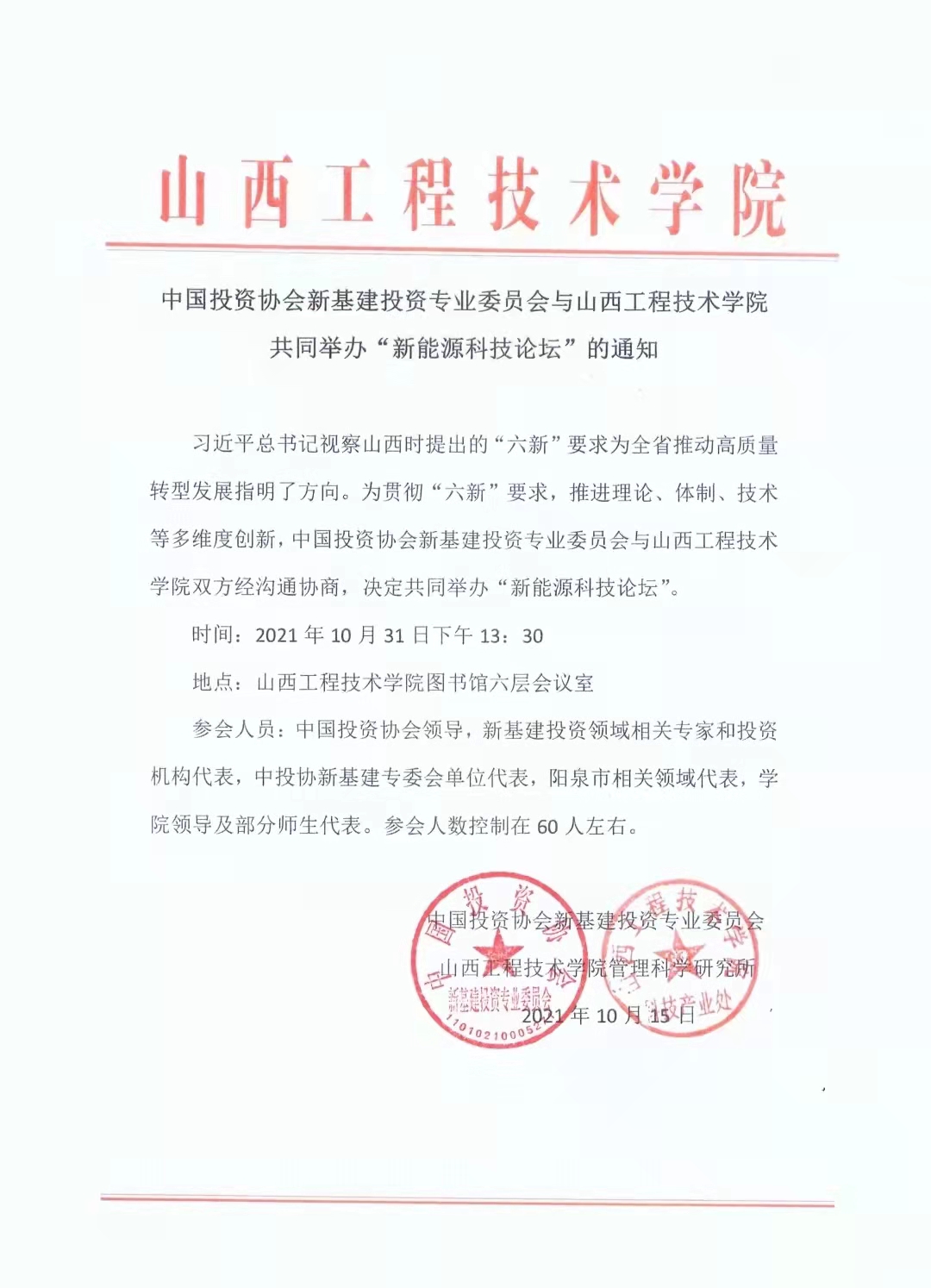 中国投资协会新基建投资专业委员会与山西工程技术学院共同举办“新能源科技论坛”的通知