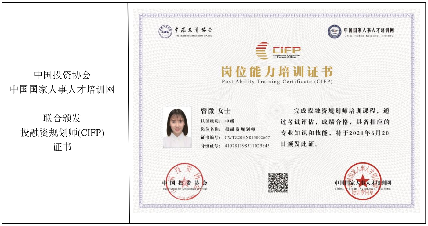 项目五大竞争优势 1.中国投资协会是国家一级协会,具有行业领域的专业性和权威性,同时由人社部中国国家人事人才培训网联合培训、颁证,并纳入国家人事人才库查询。 2.投融资机构直接参与线下授课和活动交流,线下交流平台和培训项目相互引流,既可解决企业融资难题,又通过培训过程获取优质备投项目,合作伙伴双重获利。 3.技术体系优质、完备。项目涵盖初、中、高三个级别,国内外投融资行业内顶级专家组成讲师团成员,且提供线下活动交流。线上及线下课程、活动齐备,持证人可获进一步提升机会。 4.项目具有唯一性,国内目前不存在定位相同的培训项目,充分惠及考生刚性学习需求,培训价格体系与同类咨询行业收费相比,质优价廉、便于推广。 5.学员和参训单位可根据国家、地方政策享受职业教育补贴,此外我们近期积极争取一批政策落地,增加项目含金量。 项目的价值 1.《投融资规划师》项目符合国家对促进中国企业发展、提升企业融资能力、拓宽融资渠道的若干政策,符合中国经济发展趋势,有助于社会经济的发展和社会稳定。 2.目前培训市场暂无由中国国家级专业组织、机构发起的专业性、系统性、实用性符合市场需求的体系化的投融资技术培训项目,《投融资规划师》项目的设立有助于填补市场空白,解决企业所急需的投融资专业从业人才的实际需求。 3.《投融资规划师》项目的运营工作,将积极整合多年来中国投资协会所积累的社会、学术资源、政策资源,具有别的机构所不具备的资源优势。 4.在协会的支持下,与国内诸多金融、投资、交易机构具有良好的合作关系,具有一大批不仅具有专业能力,而且具有实践操作经验的专业团队成员,具备以教学育人为核心目的技术开发能力和丰富的教学案例可使用。 5.在协会和上级主管部委的指导下,我们具有多年的为企业提供投融资专业培训服务的工作经验,了解企业对财经、金融方面的需求,清楚企业方面对融资过程管理的短板之所缺,能够有针对性的提供教学辅导。 6.协会在积极参与各政府主管机构、协会等组织的全国性、系统性项目之余,积累了多年的项目运营管理经验,具备运作全国性项目的推广、运营能力,具备专业的运营管理队伍和稳定的合作渠道伙伴。 7.具备高效的项目、资源整合能力,与众多核心企业、服务机构、政府服务机构等具有良好的合作基础,未来亦将积极整合各项资源,为企业参训学员提供各方面的服务支持。 CIFP岗位能力证书 参加培训,完成学习并通过考试、测评成绩合格的学员,可获得相应级别的投融资规划师(CIFP)岗位能力培训证书,该证书由中国国家人事人才培训网和中国投资协会联合颁发,持证人信息纳入国家人事人才库。