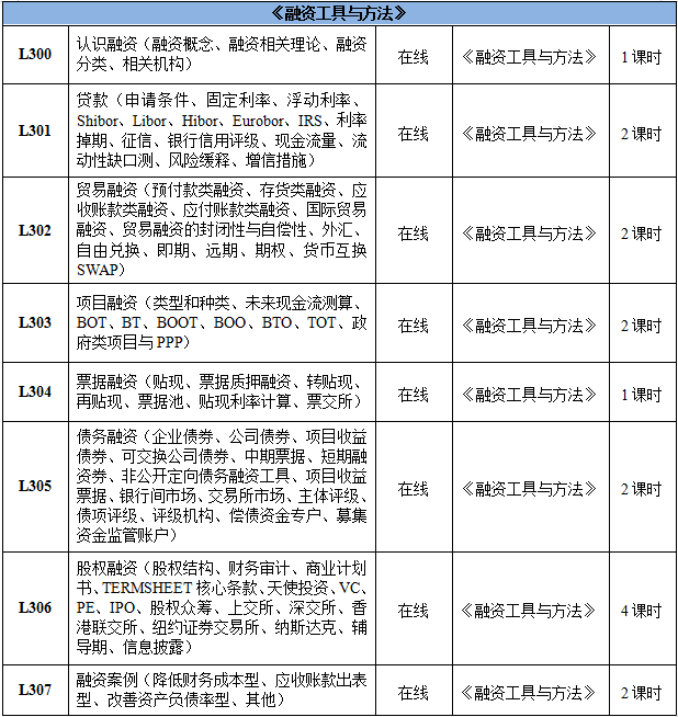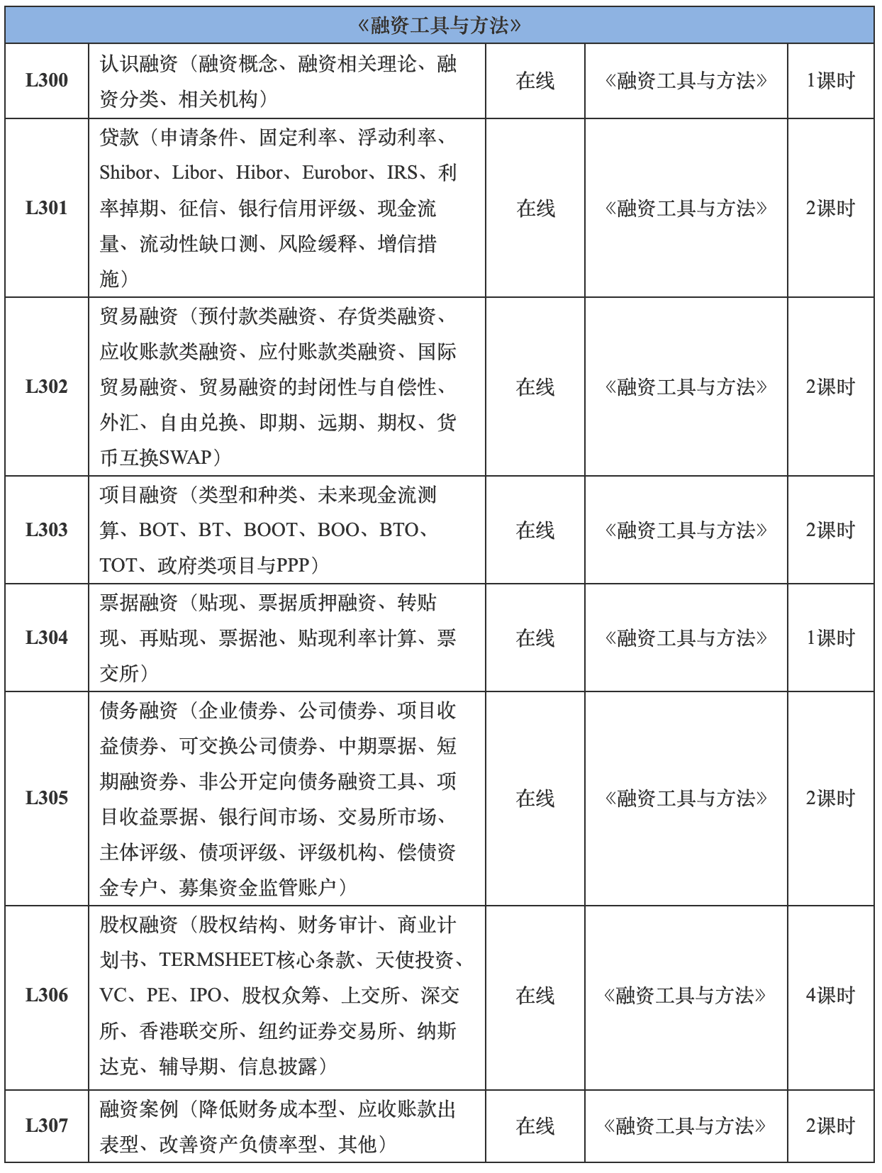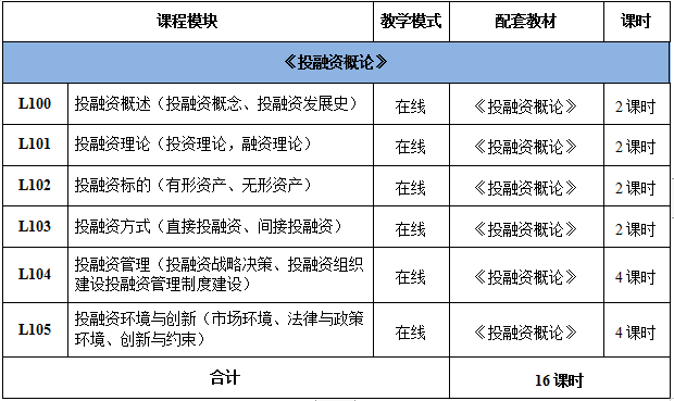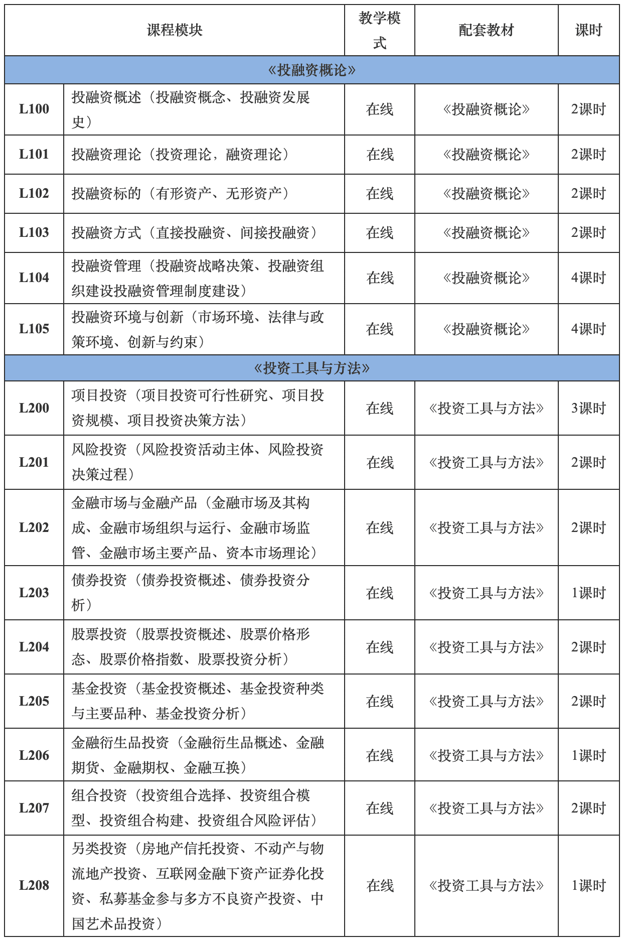 CIFP项目初级培训课程 导读:大专及以上财经、金融、管理相关专业在校生和应届毕业生;有志于从事金融、投融资行业的初级从业者。 一、课程对象 1. 大专及以上财经、金融、管理相关专业在校生和应届毕业生。 2. 有志于从事金融、投融资行业的初级从业者。 二、课程教材 《投融资概论》