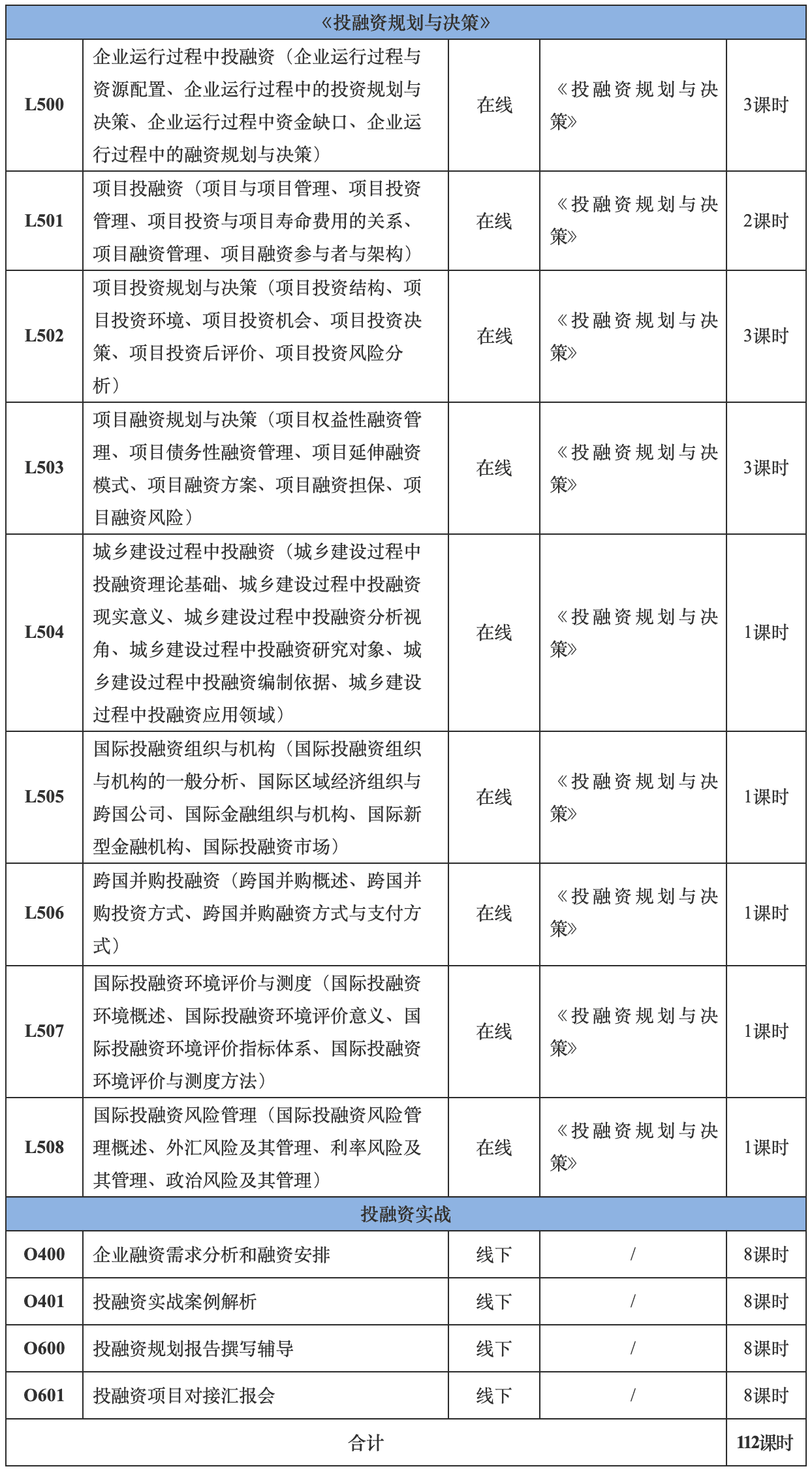 四、课程特色 1.《投资工具与方法》详细介绍了投资领域中的实用方法、风险组合理论、资本资产定价模型、套利定价理论、市场有效性、证券评估、衍生证券、资产组合管理等重要内容。课程结构清晰,设计独特,内容上注重理论与实践相结合,使学员了解证券分析和定价的本质。此外,通过来自新兴市场和发达市场的真实案例,进行实际应用教学,使学员对投资组合和证券分析形成严谨且专业的知识框架。 2.《融资工具与方法》课程在内容上注重跨学科知识的衔接;力求方法论上的指导性和可操作性。课程主要包含了现代企业融资方法的内涵、特点、程序、优缺点,以及融资基础、融资环境、融资结构、融资风险管理等内容。 3.面授课程将以企业融资案例分析和投融资政策及市场环境分析出发,为学员带来干货满满的真实案例剖析和市场政策讲解。 五、学员收益 1.掌握投资学的基本理论、基本知识和基本方法,通晓与投资学专业密切相关的管理学、法学等学科的基本知识; 2.形成基本的投资素养:掌握社会科学和自然科学相结合、定性与定量相结合的分析方法,能够较好地运用数学、统计学、计量经济学等分析方法对现实投资问题进行分析研究; 3.熟悉国情,熟悉国家有关投融资的方针、政策和法规; 4.了解国内外本学科的理论前沿、发展动态和中国投资发展与改革需要解决的重大问题。 CIFP项目高级培训课程 一、课程对象 1.金融行业机构、投资及投资咨询机构的高级从业者; 2.非金融行业企业,参与投融资项目决策的管理者,决策者。 二、课程教材 《投融资概论》、《投资工具与方法》、《融资工具与方法》、《企业并购与重组》、《投融资规划与决策》